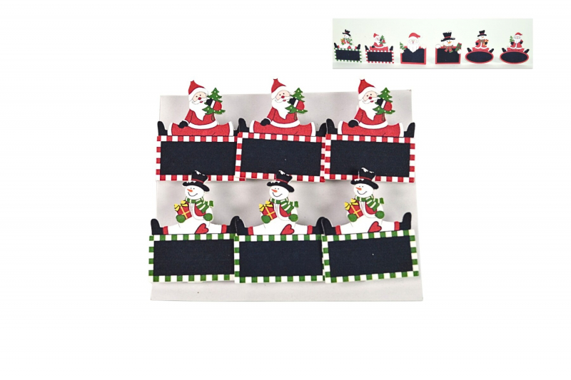 Súprava vianočných ozdobných tabuliek na štipci s veselými motívmi Santu a snehuliakov. Každá tabuľka má malú čiernu plochu vhodnú na krátky text – meno, číslo stola, odkaz alebo označenie darčeka.