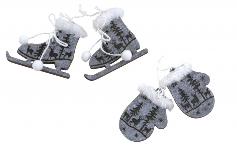 Štýlová vianočná závesná dekorácia v tvare zimných korčúľ a rukavíc s jemným škandinávskym motívom lesa a jeleňov. Prijemná sivá farba v kombinácii s bielym kožušinovým lemom a drobnými bambuľkami vytvára útulnú zimnú atmosféru.