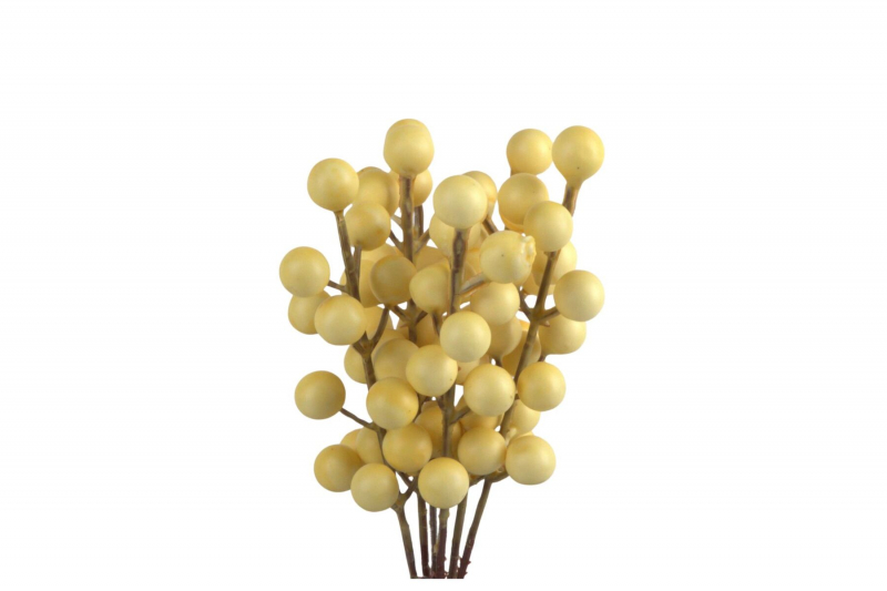 Vneste do svojho interiéru jemnosť a prirodzenú eleganciu s týmto dekoratívnym zväzkom bobúľ. Husté zoskupenie malých guľatých bobúľ v krémovo-žltom odtieni pôsobí sviežo a harmonicky, pričom realistické spracovanie stoniek dodáva celku autentický vzhľad.