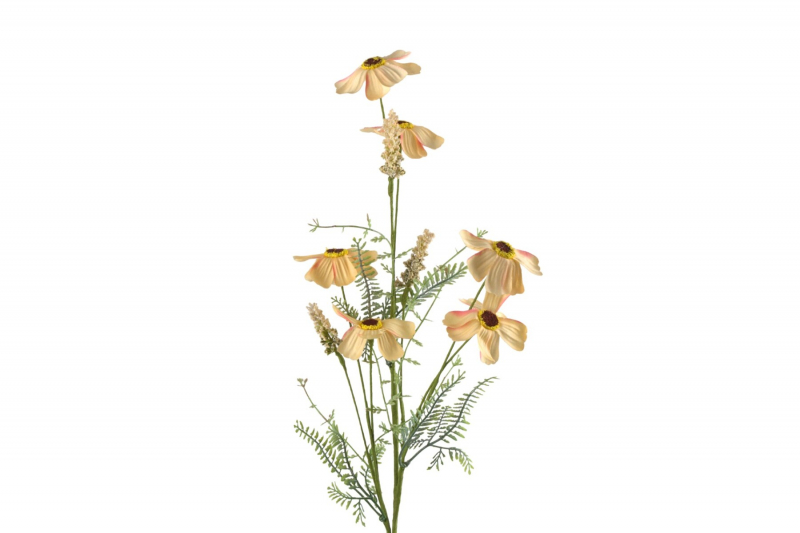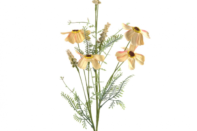 Dekoratívny umelý konár kosmosu (krasuľky) v jemnej žltej farbe je krásnym doplnkom do každého interiéru. Jemné kvety s typickým žltým stredom spolu s detailne spracovanými listami vytvárajú prirodzený a elegantný vzhľad, ktorý pripomína rozkvitnutú letnú záhradu.