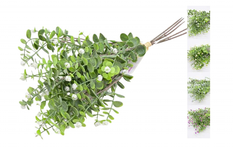 Dekoratívna umelá kytica kvitnúcej trávy s drobnými kvetmi a jemne štruktúrovanými listami v prírodnom vzhľade. Kytica je zviazaná do jedného zväzku a je dostupná v mixe farebných prevedení.