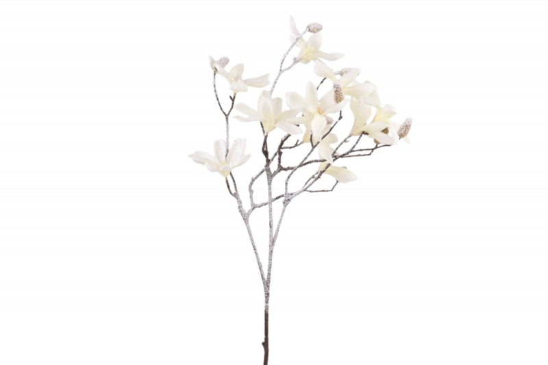 Vneste do svojho interiéru zimnú eleganciu s týmto umelým konárom magnólie so zasneženým efektom. Jemné krémovo-biele kvety a trblietavý povrch vytvárajú luxusný, sviatočný vzhľad, ktorý krásne vynikne vo váze, vencoch či sezónnych aranžmánoch.