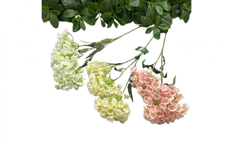 Dekoratívny konár s tromi bohatými kvetmi hortenzie vynikne v každej váze aj aranžmáne. Vďaka realistickému spracovaniu kvetov a listov pôsobí prirodzene a elegantne.