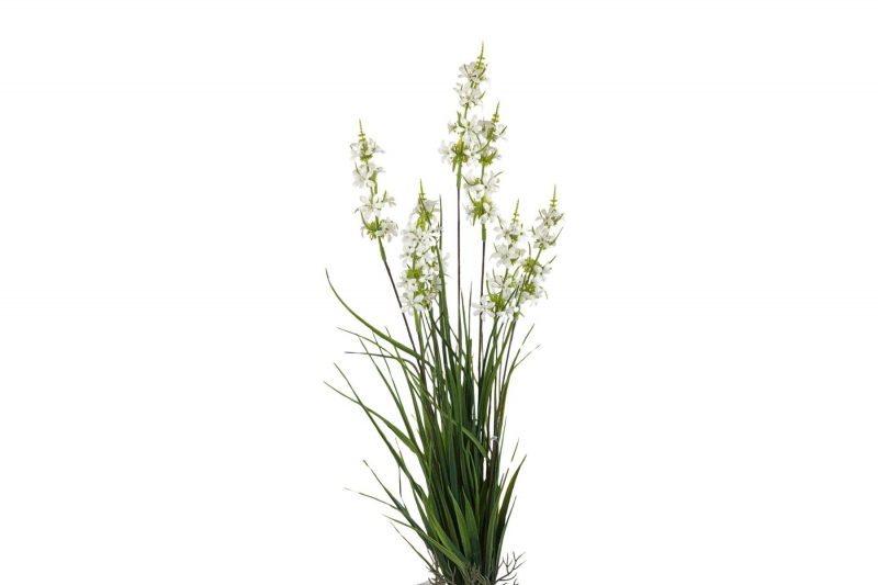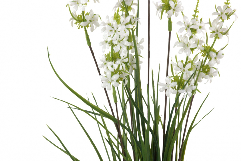 Vneste do svojho interiéru jemnosť a sviežosť s elegantným umelým trsom poľných kvetov v bielej farbe. Štíhle stonky doplnené drobnými bielymi kvietkami a hustými zelenými listami vytvárajú prirodzený, vzdušný vzhľad pripomínajúci rozkvitnutú lúku.